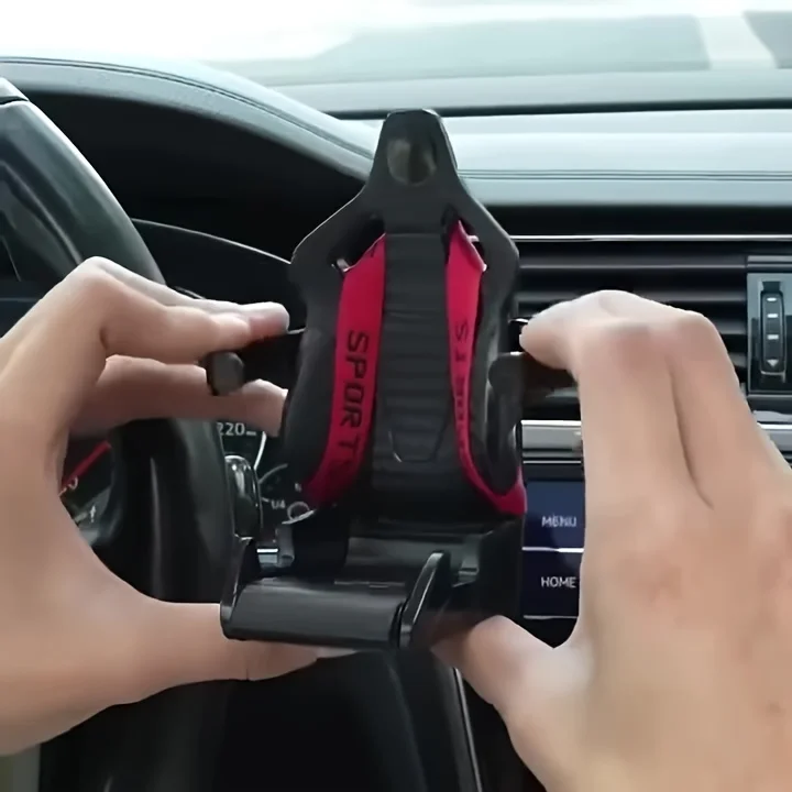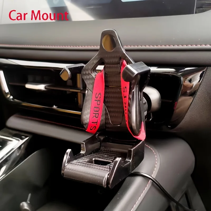 Soporte para teléfono móvil con diseño de asiento de carreras negro, con ventosa para smartphones.